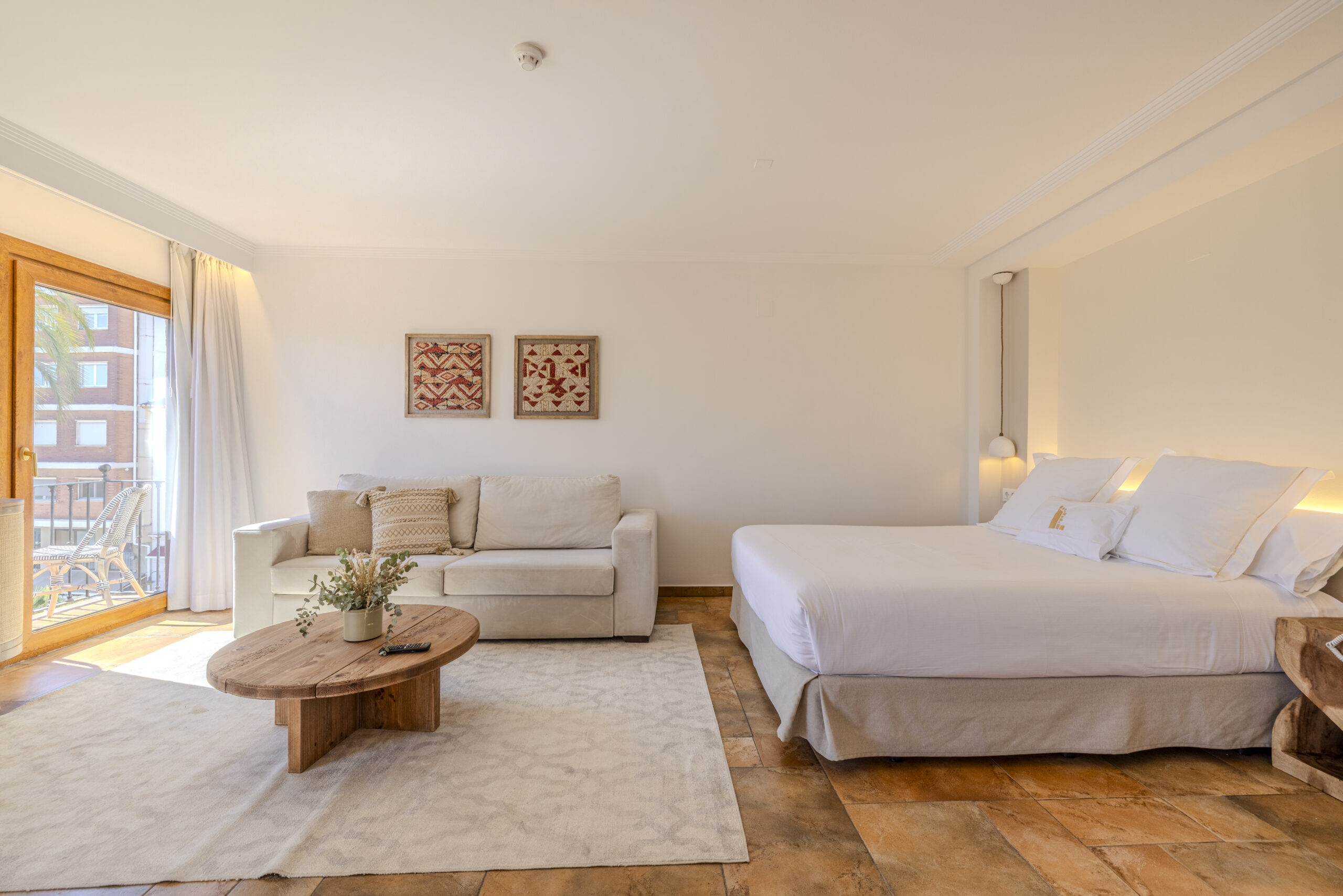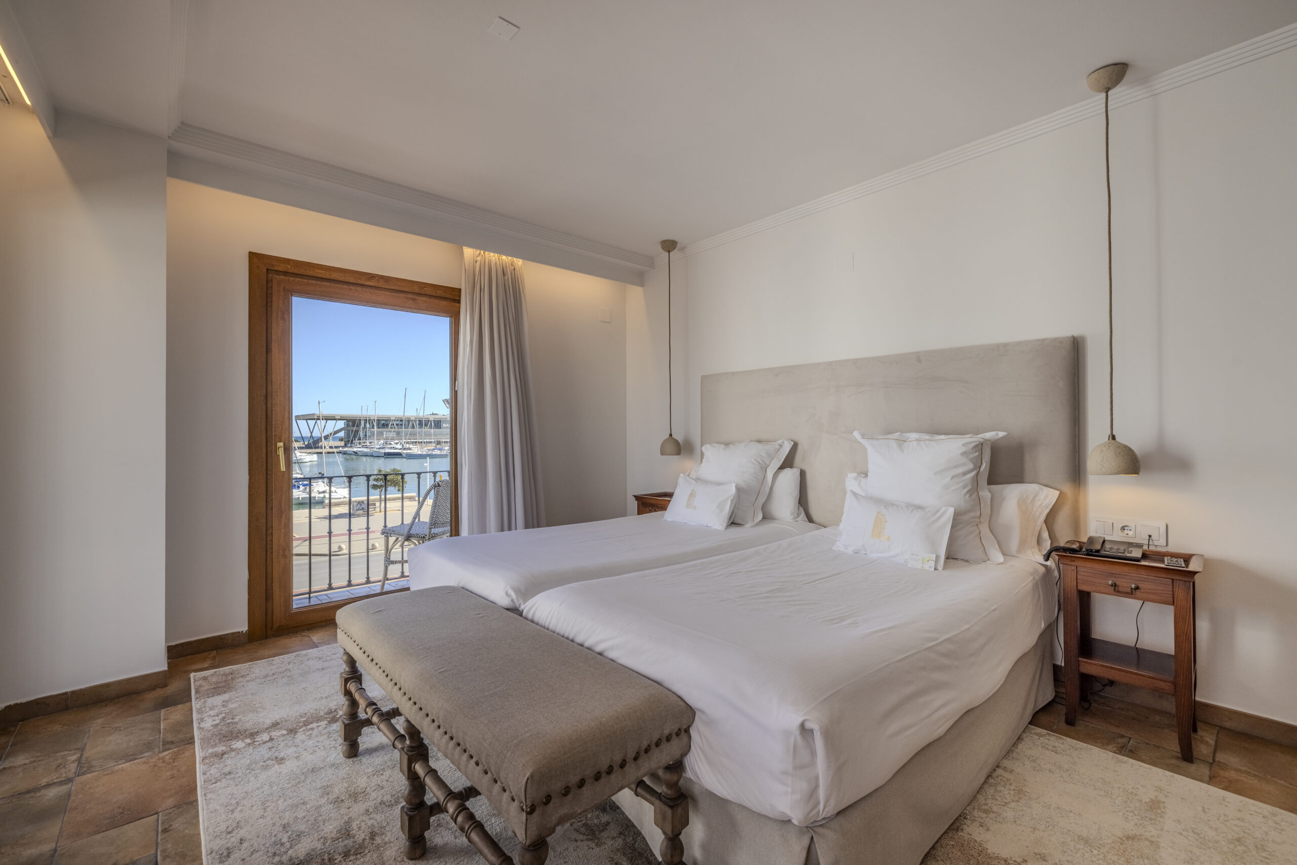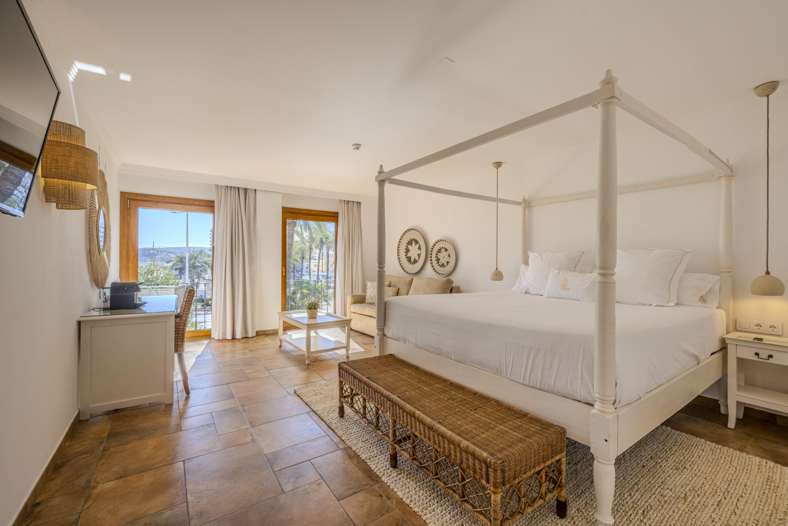 In unserer Junior Suite, die einen schönen Blick auf den Hafen und das Meer bietet, treffen Holz und Weiß aufeinander.