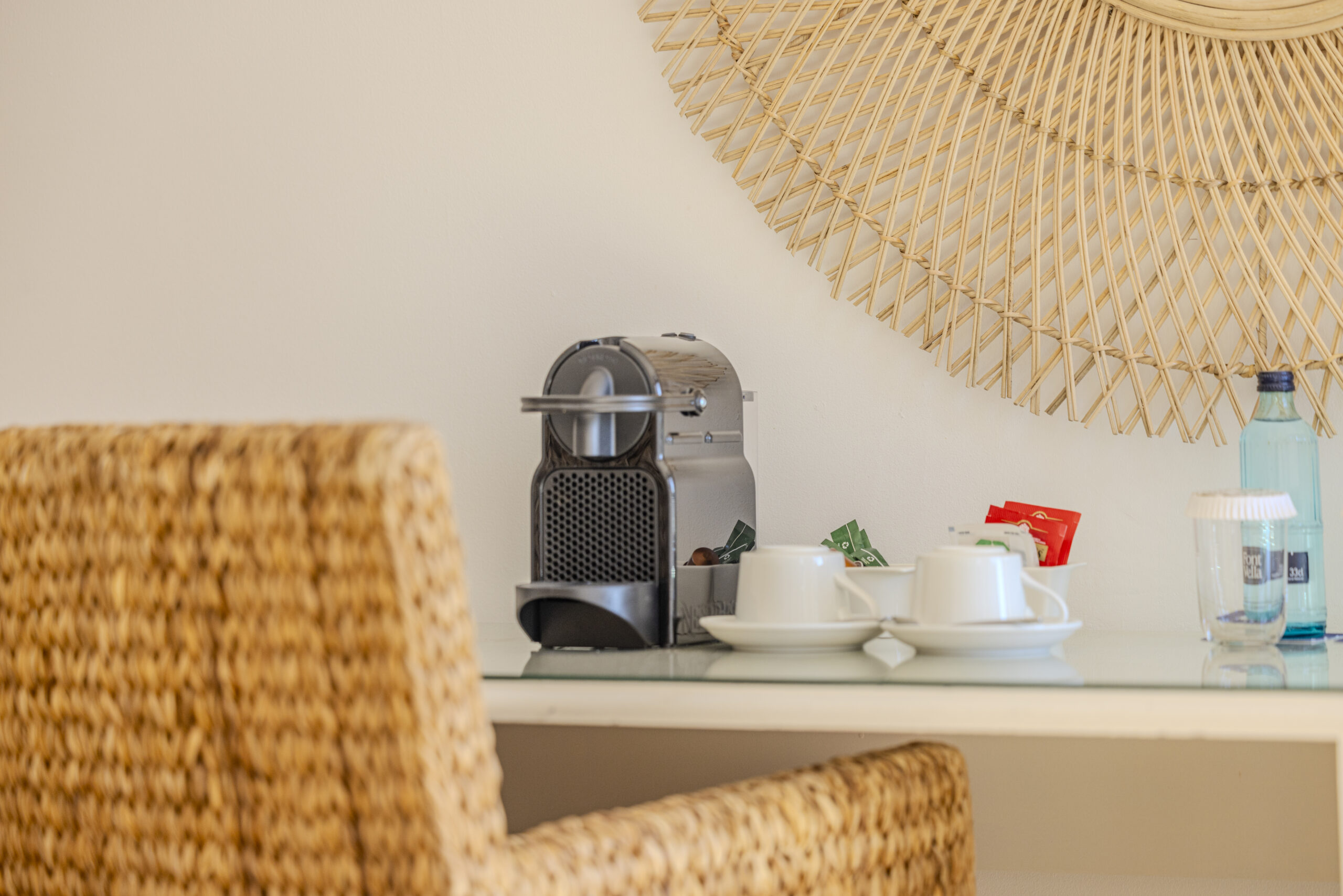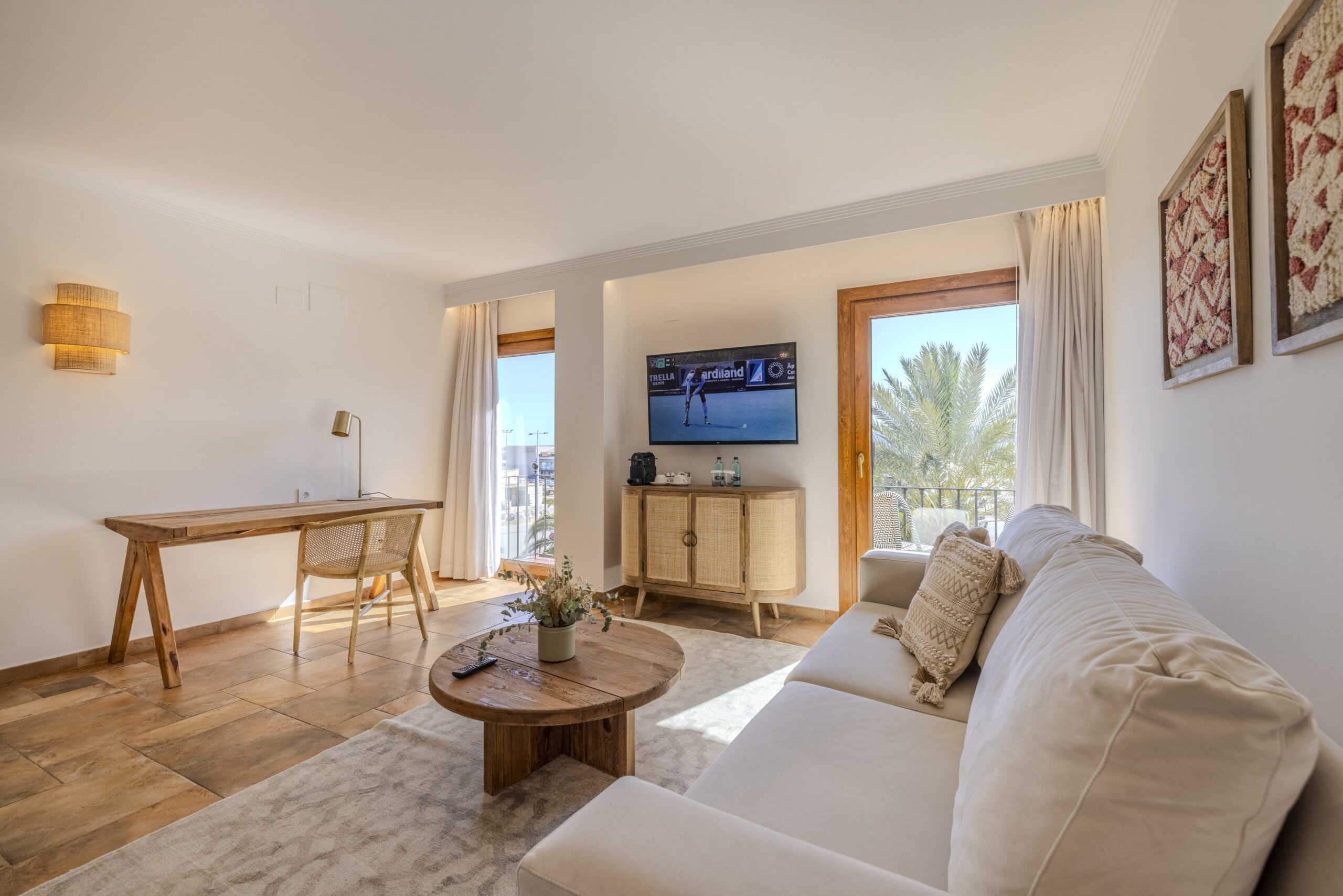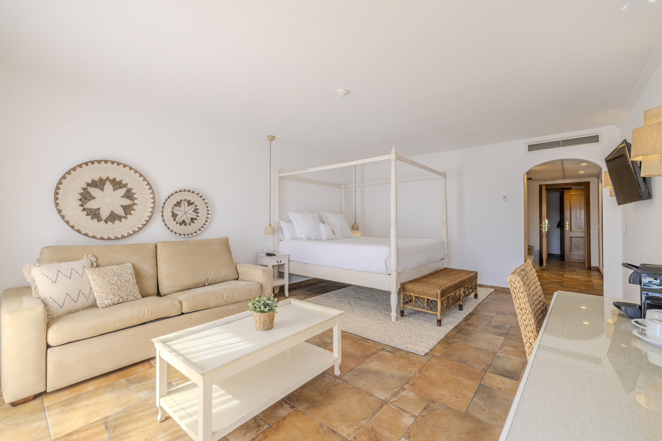 In unserer Junior Suite, die einen schönen Blick auf den Hafen und das Meer bietet, treffen Holz und Weiß aufeinander.