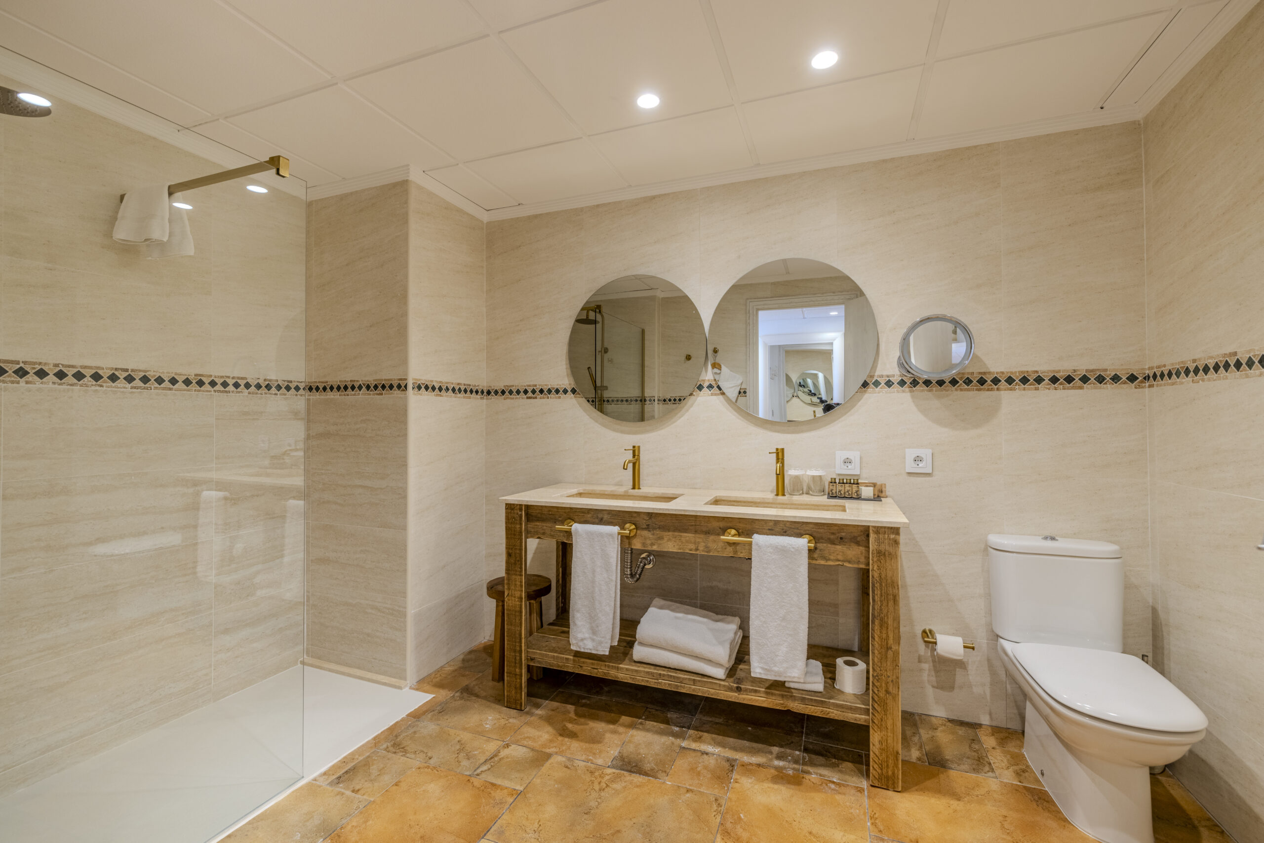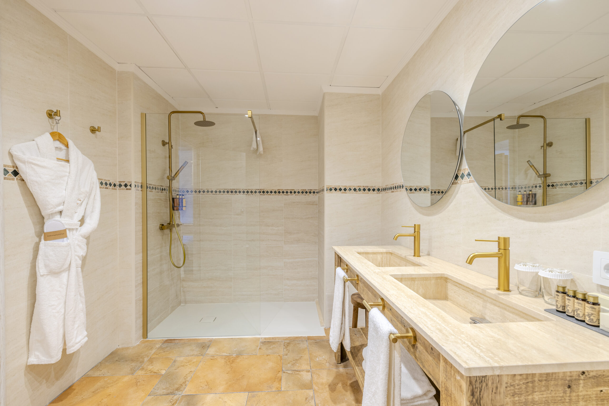 Dusche oder Bad, Toilettenartikel „La Posada del Mar“, Bademantel und Haartrockner.